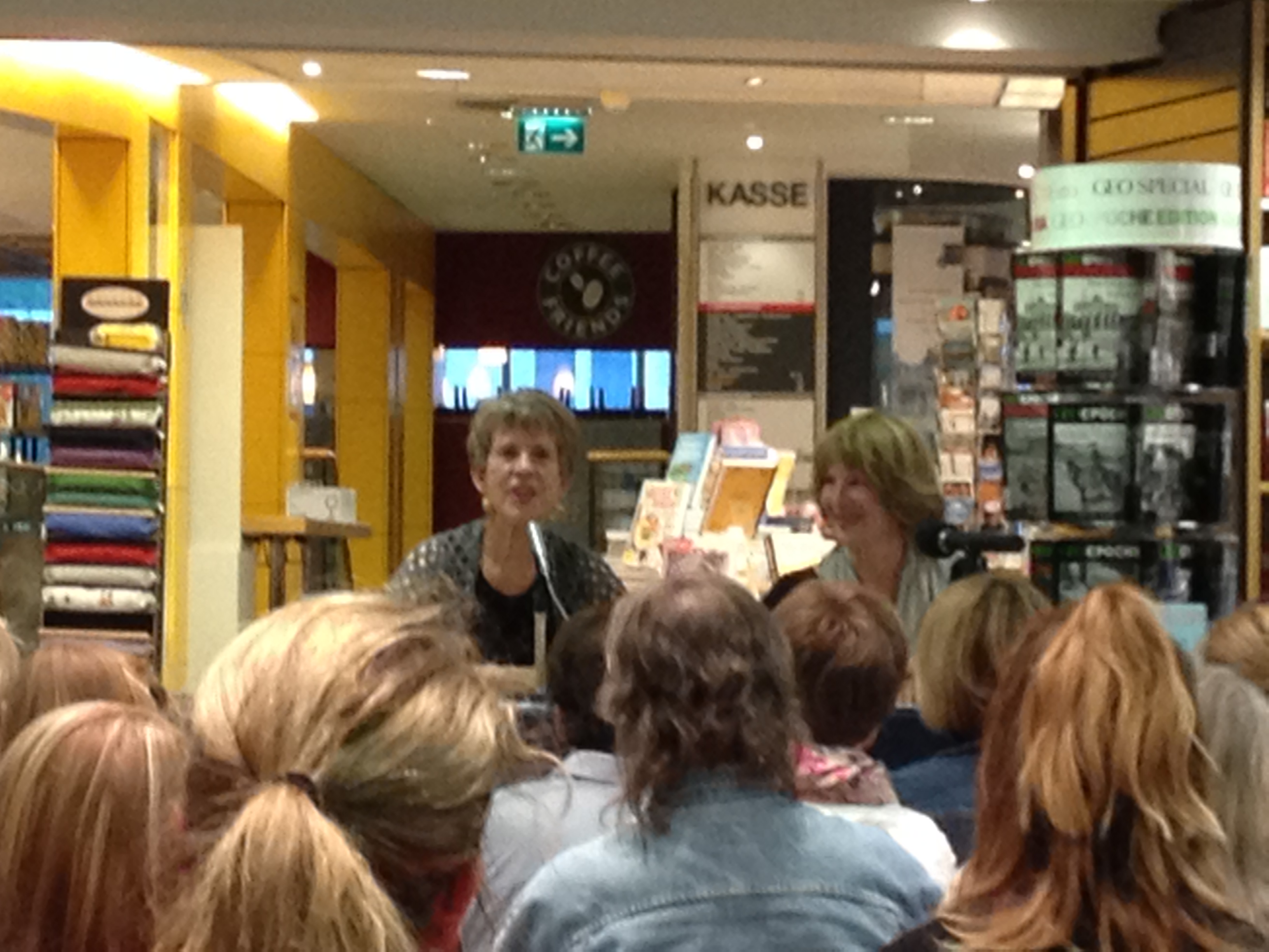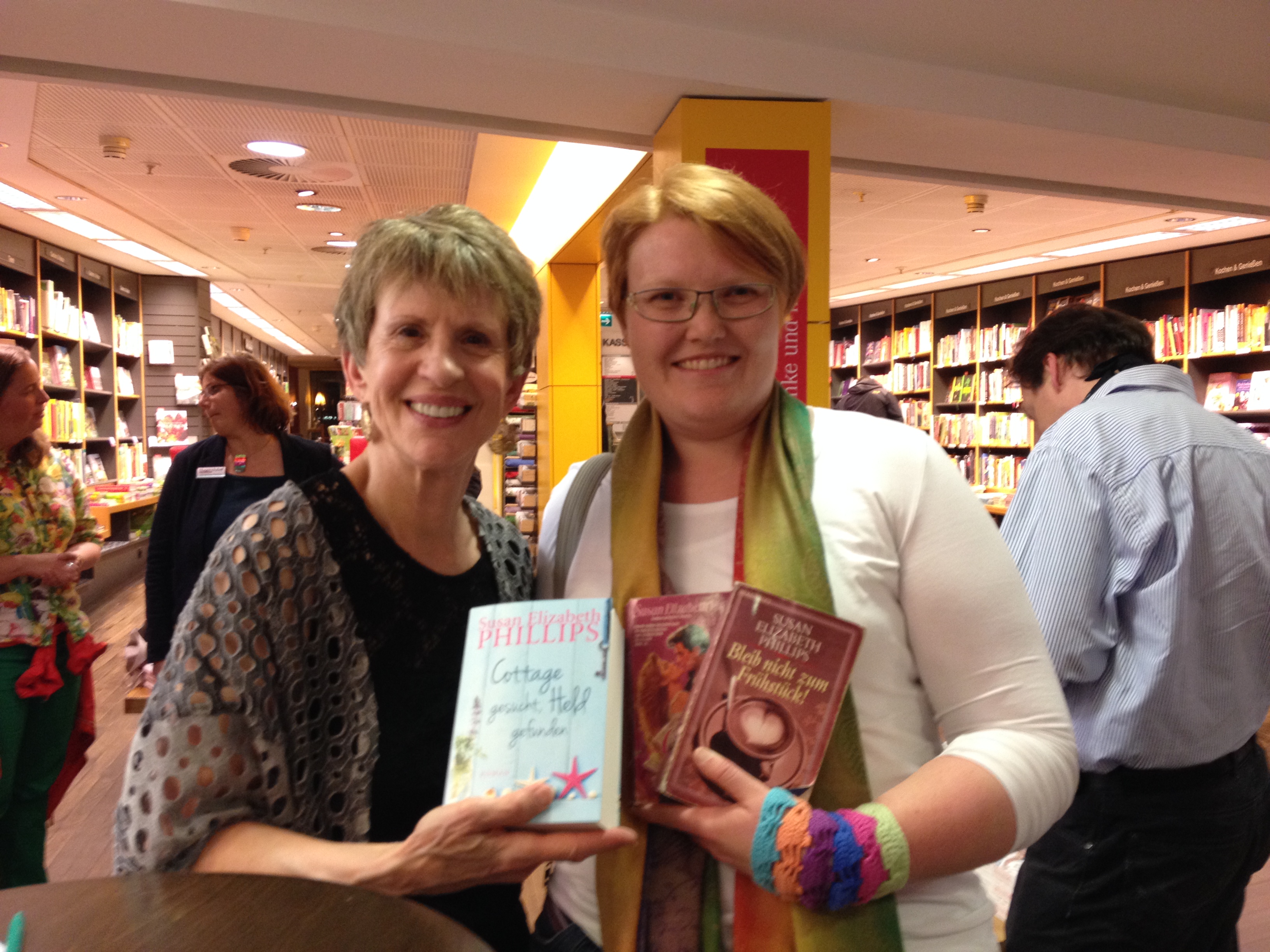 Bisher habe ich alle Bücher von Susan Elizabeth Phillips gelesen. Also musste ich mich für dieses Buch direkt bei blogg dein Buch für dieses Buch bewerben. Und hatte Glück. Vor der Lesung am 06. Mai hatte ich das Buch extra noch nicht gelesen. Ich wollte die ersten Zeilen von Susan selbst hören. Ohne den Inhalt zu kennen saß ich ganz gespannt in der Buchhandlung in Hannover. Und wurde, wie zu erwarten war, nicht enttäuscht. „Cottage gesucht, Held gefunden“ ist ein Liebesroman, der mich von der ersten bis zur letzten Seite in eine wundervolle Traumwelt gebracht hat. Welche Frau träumt nicht von einem Helden, der stark und mächtig ist? Wer möchte nicht erobert werden? In diesem Roman wird genau das erfüllt. Es gibt die schwache, weibliche Hauptfigur Annie, die mit einer Lungenentzündung auf eine abgeschiedenen Insel fährt. In der Hoffnung dort gesund zu werden und den Schatz ihrer Mutter zu finden, um ihre Schulden zu begleichen. Und es gibt den starken, mächtigen, männlichen Helden als zweite Hauptfigur. Theo ist der schwarze Reiter in dunkler Nacht und verbreitet durch seinen Roman Angst und Schrecken. Es sind also zwei gegensätzliche Figuren, die natürlich zu einander finden werden. Von Beginn an ist dem Leser klar, dass am Ende des Buches sich die zwei Hauptfiguren finden. Denn es ist in der Regel immer so. Und gerade dieses Wissen macht das Lesen des Buches zu einem schönen Zeitvertreib. Ich habe das Buch fast in einem Rutsch, zur Freude meines Mannes, gelesen. Eingekuschelt in eine dicke Decke, bewaffnet mit einer Tasse Tee habe ich auf der Terrasse gelesen und verträumt das Buch gelesen. Von der ersten bis zur letzten Seite musste ich mit Annie und Theo mitfiebern. Habe die Hoch und Tiefs verfolgt und konnte das Buch nicht vorher aus der Hand legen, bis sie endlich zueinander gefunden hatten. Ich weiß ich nehme das Ende jetzt schon vorweg. Aber ganz ehrlich, wir wollen einen Liebesroman wegen der Geschichte lesen, denn ein Happy End ist per Definition des Liebesromans ja schon vorprogrammiert. Ich kann dieses Buch nur wärmstens empfehlen. Es ist der Ideale Begleiter für einen verregneten Sonntag wie auch ein Tag in der Sonne. Und bevor ich es vergesse ich habe aus Hannover ja noch Fotos dabei.