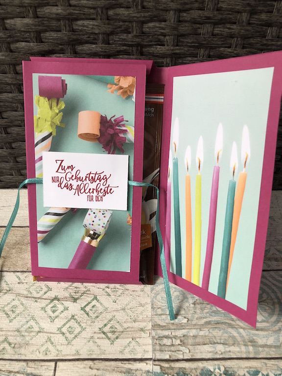 Die Verpackung ist von der Größe so gewählt, dass auch eine Tafelschokolade darin Platz findet. Das Innenleben enthält Platz für liebe Worte zum Geburtstag und ein paar Kerzen auf Papier.