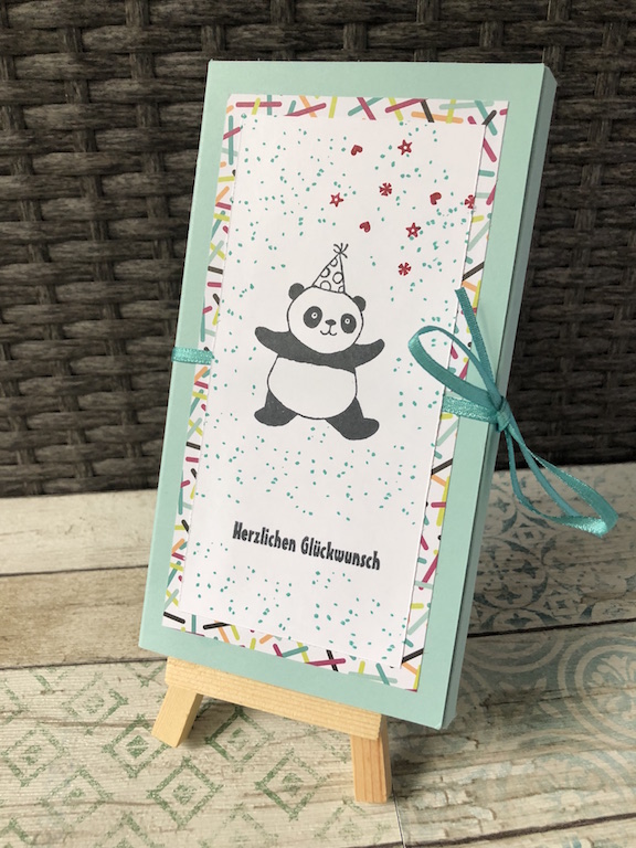 Zum Geburtstag kann man gut einen Kuchen verschenken. Bei Zeitknappheit geht als Geste auch ein Tassenkuchen. Hier versteckt sich der Tassenkuchen hinter einem Party Panda.