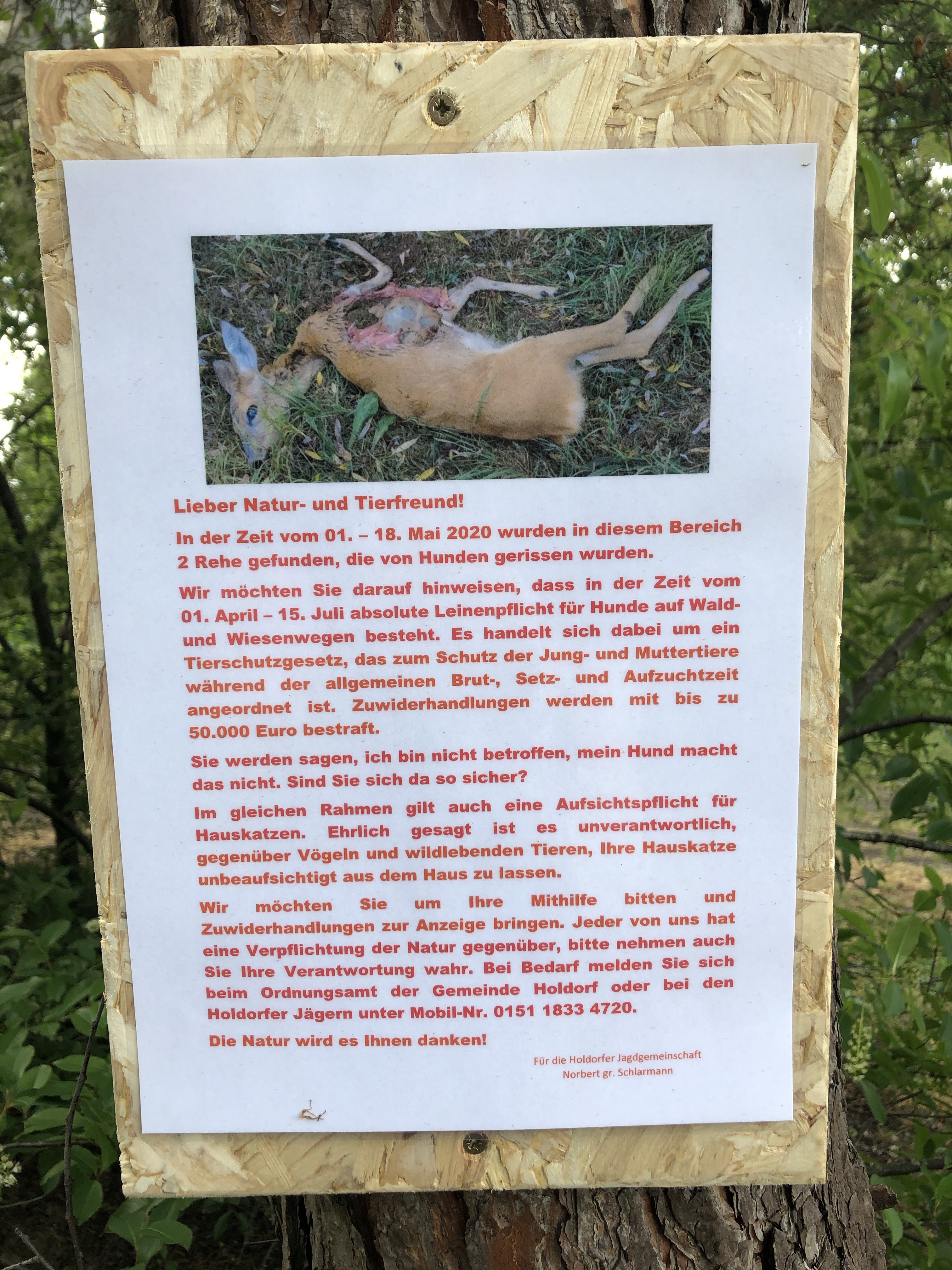 Aus gegebenem Anlass ein kleines Update. Gestern habe ich eine etwas andere Runde wieder durch den Wald genommen. Die oben erwähnte Strecke an der ich die Joggerin mit Hund getroffen habe. Mit erschrecken fiel mir das neue Schild am Wegesrand ins Auge. Leider unterstützt es meine Beobachtung, dass viele ihren Hund einfach laufen lassen. Bitte leint eure Hunde im Wald an! Unsere Waldbewohner gaben das so nicht verdient.