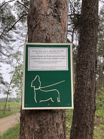 Die Schilder sind für mich als Leihen auf den ersten Blick eindeutig. Mein Hund ist hier im Wald anzuleinen. Die roten Schilder besagen, dass ich zum Schutz meines Tieres vor dem Fuchsbandwurm ihn lieber an der Leine führen sollte. Die grünweißen Schilder mit dem angeleinten Hund gehen etwas mehr ins Detail. Dort heißt es, dass vom 1. April bis zum 15. Juli zur allgemeinen Brut-, Setz- und Aufzuchtzeit die Hunde im Wald und in der freien Landschaft an der Leine geführt werden müssen. Dieses ist im Niedersächsischen Gesetz über den Wald und die Landschaftsordnung (NWaldLG) festgehalten.