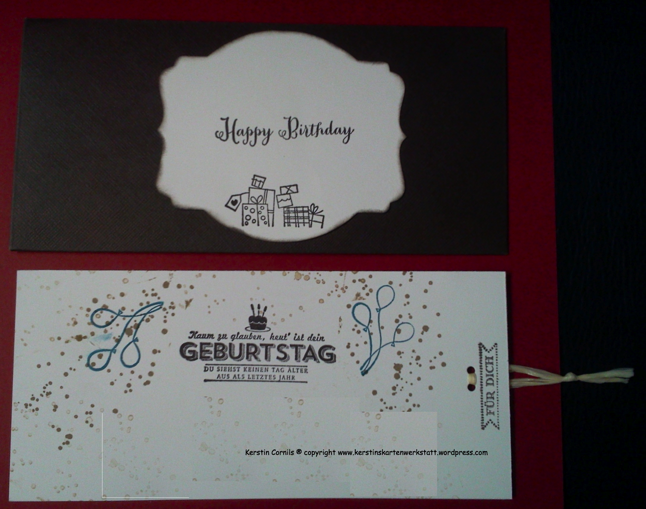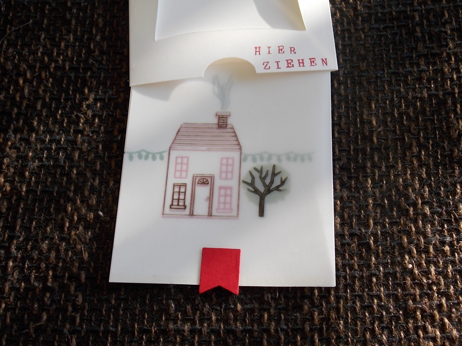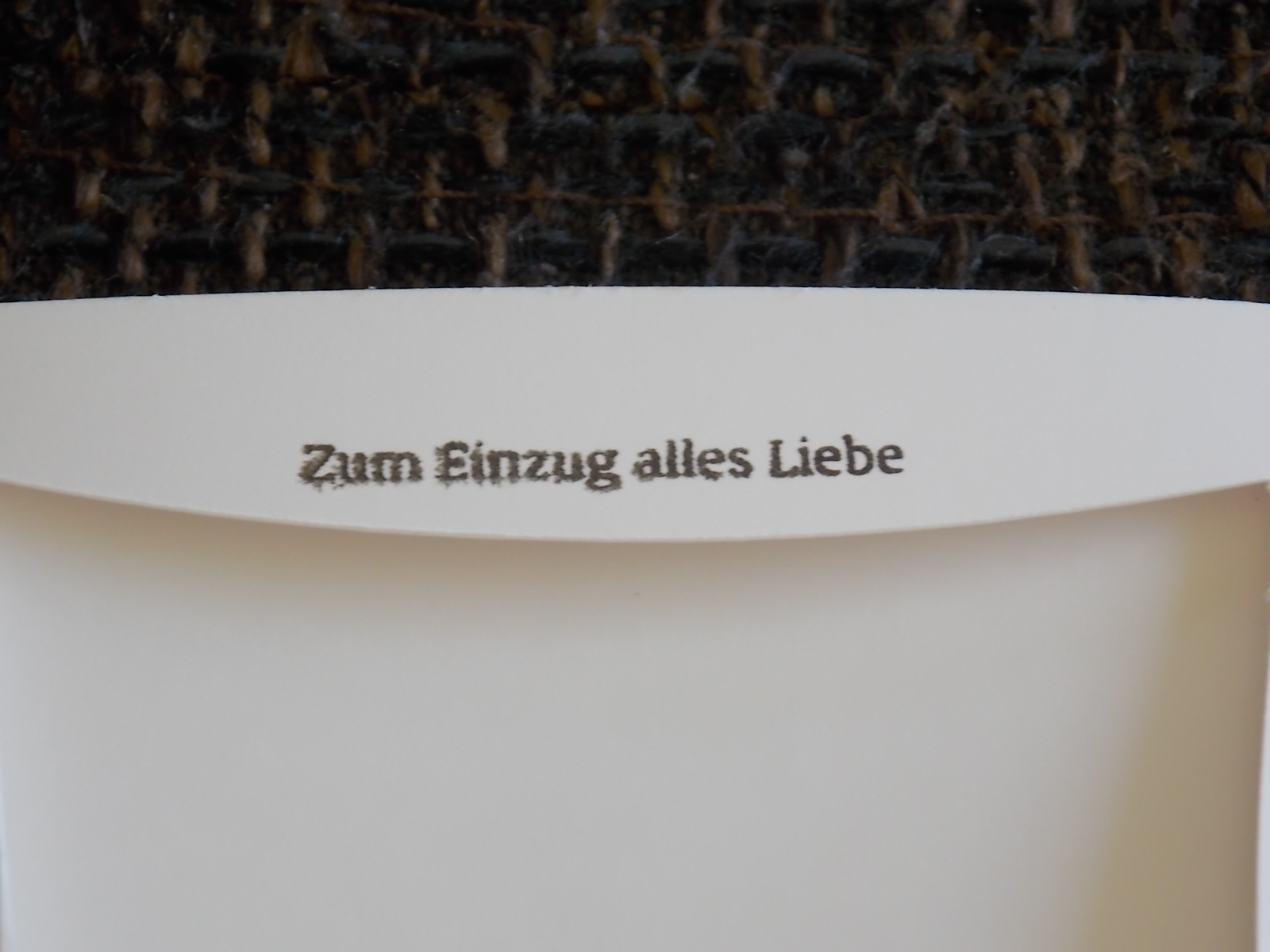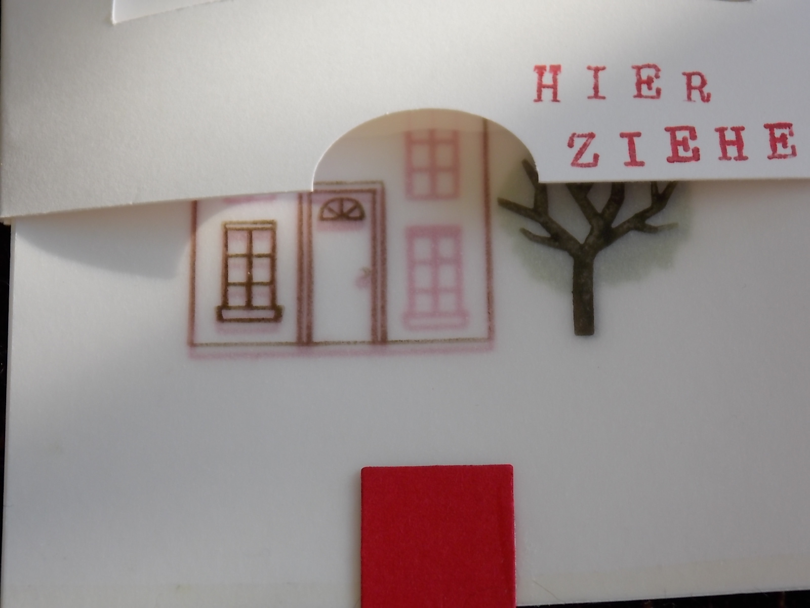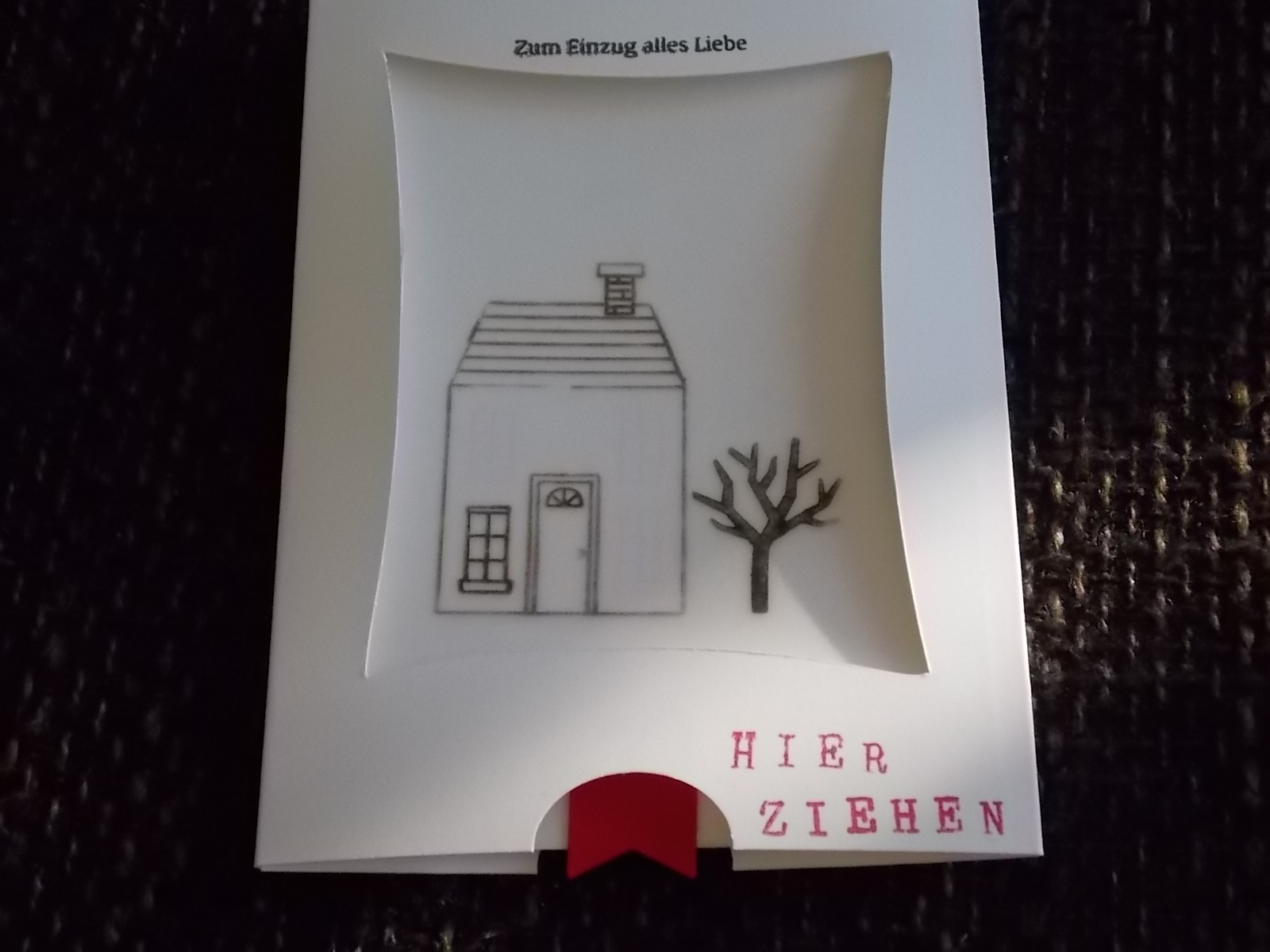 nach dem Prototypen von gestern gibt es heute eine Ziehkarte zum Einzug. Den Schriftzug fand ich in meinem neuen Stempelset. Im Katalog hatte ich gar nicht gesehen, dass neben den Weihnachts- und Hallöweengrüßen auch dieser dabei war.
