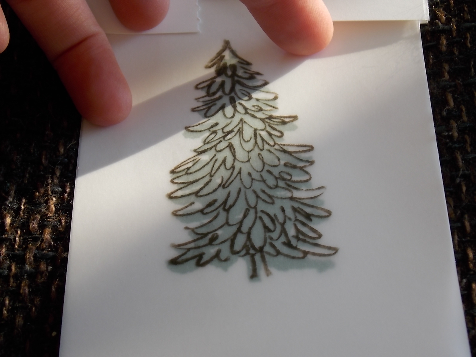 Auf dem Transparentpapier sieht man erst mal ein langweiliges Häuschen und einen toten Baum …