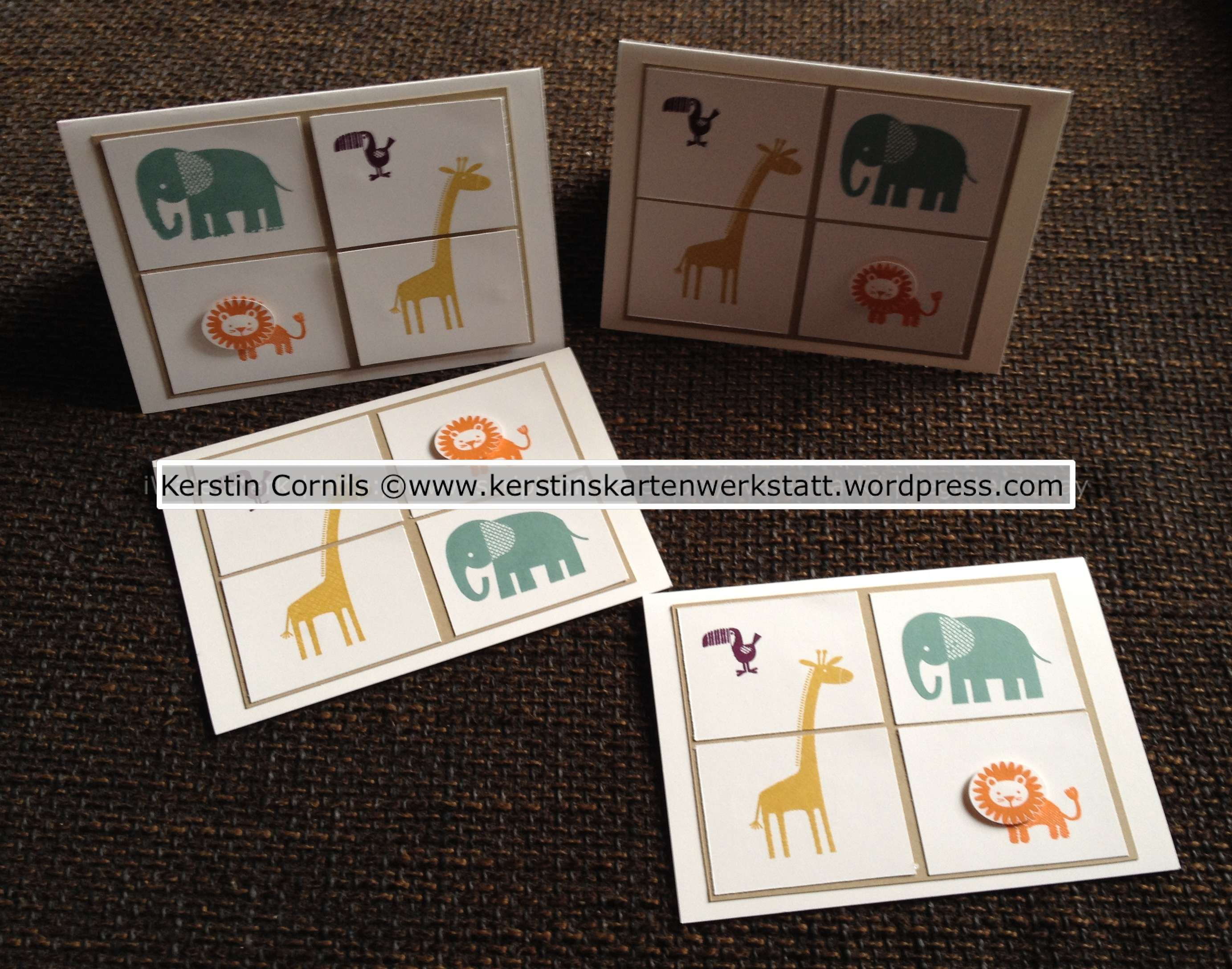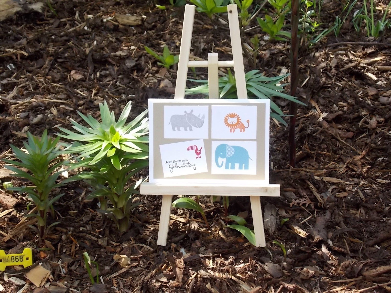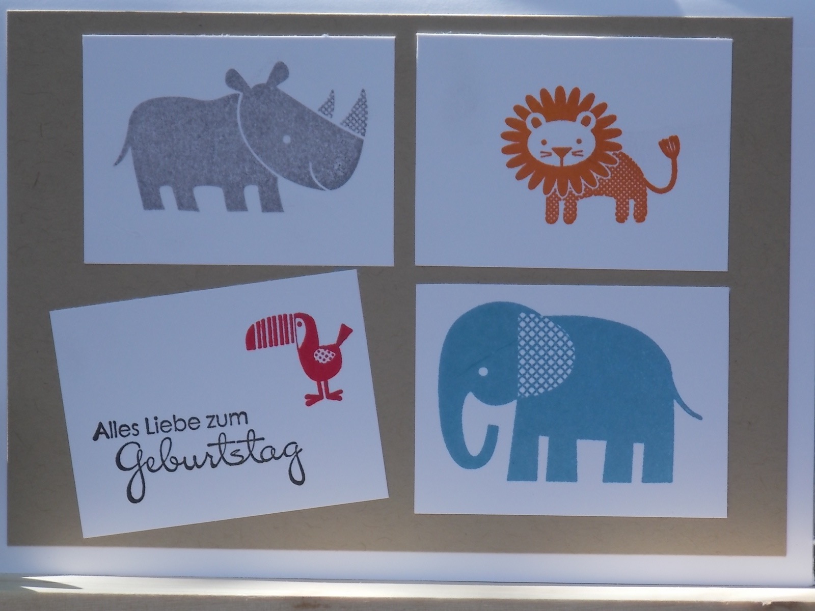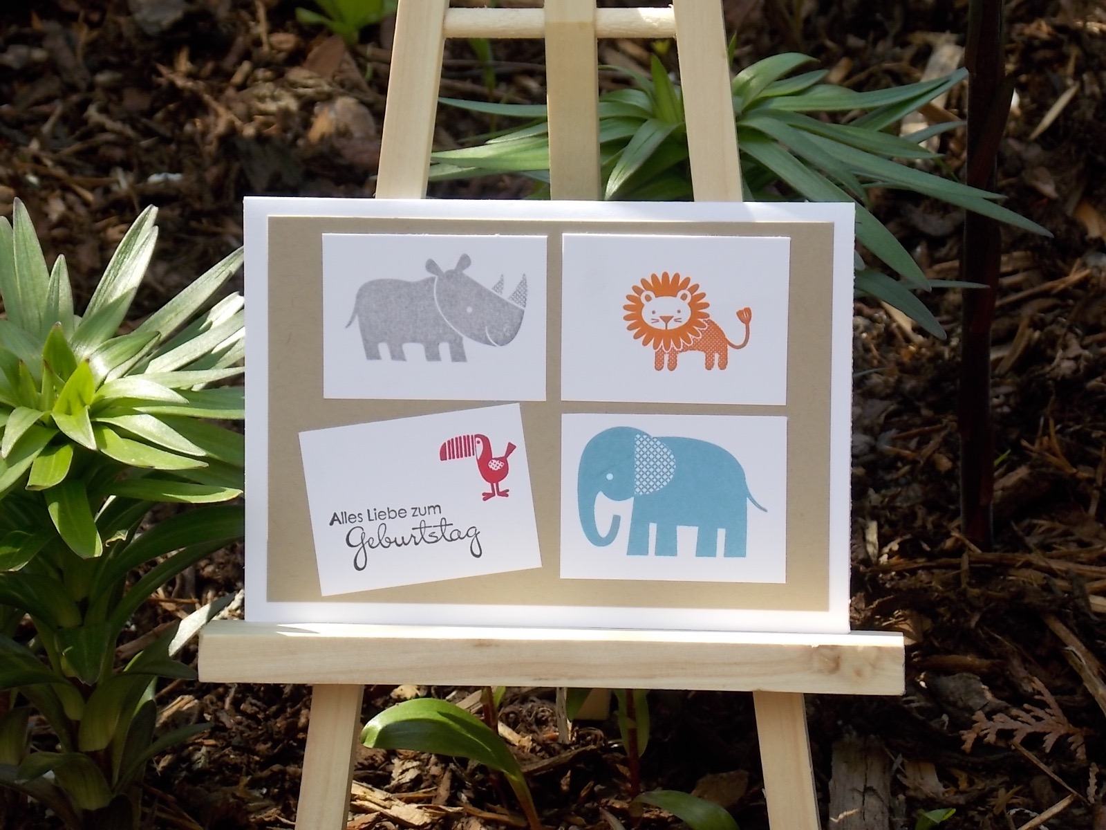 Langsam aber sicher entfaltet unsere Wein seine Blätter. Jetzt war gerade noch etwas Platz meine Karten an den Schnüren aufzuhängen. Hier mein versprochenes Liebespaar aus Nashorn und Elefant.